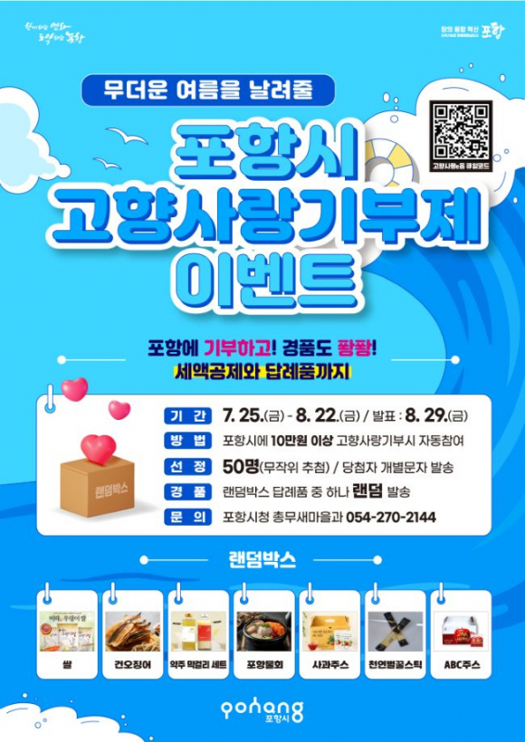 포항시는 오는 25일부터 8월 22일까지 고향사랑기부제 활성화를 위한 여름철 특별 이벤트를 진행한다.