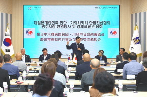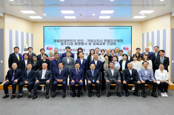경주시는 18일 청사 대회의실에서 일본 민단과 가와사키시 한일친선협회 방문단(회장 다나카 카즈노리) 42명을 맞아 환영행사를 열었다. 다나카 카즈노리 회장은 일본 자민당 소속 중의원(7선)으로, 2019~2020년 일본 부흥대신(재건 담당 장관)을 지낸 정치인이자 2022년부터 가와사키시 한일친선협회를 이끌고 있다.