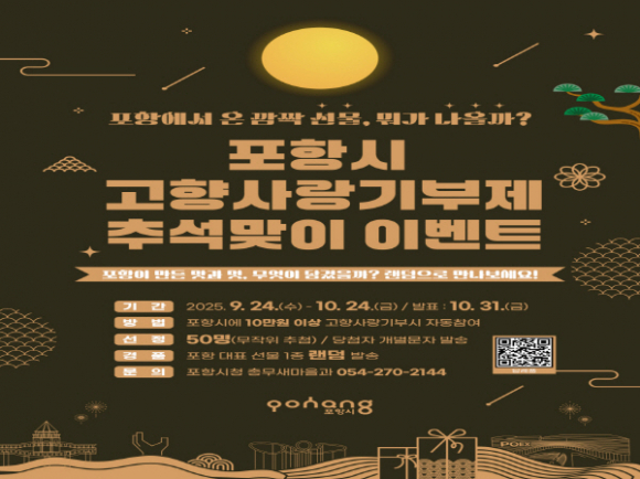 포항시는 오는 24일부터 10월 24일까지 ‘추석맞이 고향사랑기부제 특별 이벤트’를 진행한다.