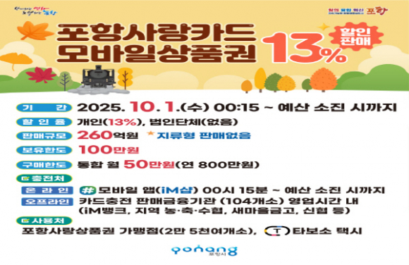 |  | | | ↑↑ 추석맞이 카드형·모바일 포항사랑상품권 13% 할인 판매 홍보 이미지. | | ⓒ GBN 경북방송 | | 포항시는 추석 명절 지역경제 활력 제고를 위해 내달 1일부터 카드형·모바일 포항사랑상품권(이하 포항사랑카드)을 260억 원 규모로 13% 할인 판매한다.