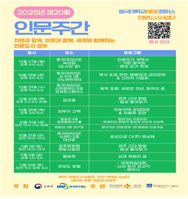 동국대 WISE캠퍼스 인문도시사업단(단장 홍은숙)이 10월 27일부터 11월1일까지 동국대 WISE캠퍼스와 경주지역 일대에서 제20회 인문주간 행사를 개최한다고 밝혔다.