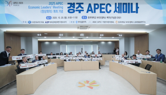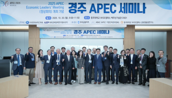 동국대학교 WISE캠퍼스(총장 류완하)가 지난 10월 20일 백주년기념관 D501에서 ‘2025 경주 APEC 세미나’를 개최했다고 밝혔다. 이번 행사는 (사)한국APEC학회와 대외경제정책연구원(KIEP)이 공동 주최하고, 우리금융지주, ABAC(APEC 기업인자문위원회), 동국대 WISE캠퍼스 글로벌융합연구소가 후원하여 진행되었으며 ‘2025 경주 APEC 정상회의의 내용과 기업의 비전’을 주제로 다자주의 복원과 기업 혁신을 위한 APEC의 역할을 모색하고, 한·미 기업인과 전문가 간 교류를 활성화하기 위해 마련됐다.