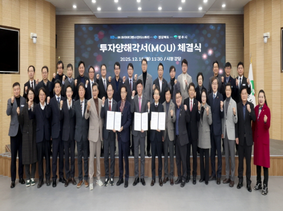 경상북도와 영주시는 15일 영주시청 강당에서 이철우 경상북도지사, 유정근 영주시장 권한대행, 임종득 국회의원, 박성만 경북도의회 의장, 김병기 영주시의회 의장, 정정모 ㈜코리아디펜스인더스트리 대표 등 20여 명이 참석한 가운데 ㈜코리아디펜스인더스트리와 경상북도·영주시 간 투자양해각서(MOU)를 체결했다.