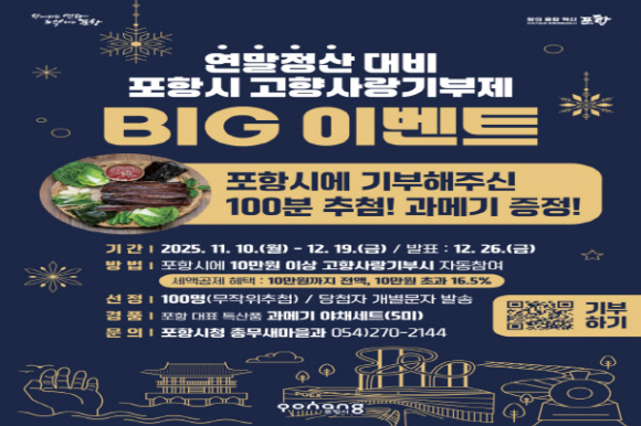 |  | | | ↑↑ 연말정산 대비 포항시 고향사랑기부제 BIG 이벤트 포스터 | | ⓒ GBN 경북방송 | | 포항시는 겨울철 대표 별미인 과메기 철을 맞아 고향사랑기부제 참여자를 대상으로 ‘과메기 증정 BIG 이벤트’를 진행하고 있다.
