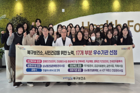 |  | | | ↑↑ 포항시 북구보건소, 보건사업 ‘17관왕’ 달성 기념촬영. | | ⓒ GBN 경북방송 | | 포항시 북구보건소는 2025년 한 해 동안 중앙부처와 경상북도 등 외부 기관이 실시한 각종 보건사업 평가에서 13개 부문 수상을, 시 내부 평가에서도 4개 부문 수상을 달성해 총 17관왕이라는 성과를 거두며 지역 공공보건 역량을 다시 한번 입증했다.