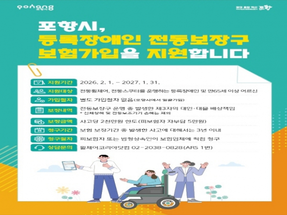 이번 보험 지원은 전동휠체어나 전동스쿠터 등 전동보장구를 이용하는 포항시 등록 장애인을 대상으로 한다. 별도의 가입 신청 절차 없이 누구나 자동으로 가입되며, 보장 기간은 2026년 2월 1일부터 2027년 1월 31일까지 총 1년이다.