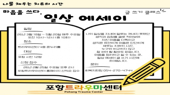 |  | | | ↑↑ ‘2026년 마음을 쓰다: 일상 에세이’ 참여자 모집 포스터. | | ⓒ GBN 경북방송 | | 포항시 북구보건소 트라우마센터는 문학 치유 프로그램인 ‘2026년 마음을 쓰다: 일상 에세이’ 글 쓰기 참여자를 모집한다.
