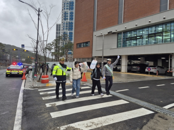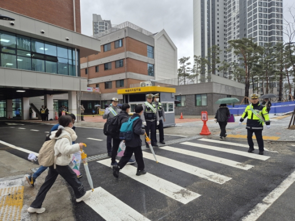 경주경찰서(서장 양순봉)는 3월 3일 초등학교 개학일을 맞아 경주시 건천읍에 새로 개교한 화천초등학교 앞에서 새학기 어린이 교통안전지도를 실시했다. 올해 처음 문을 연 화천초등학교는 개학과 함께 통학을 시작한 학생들이 새로운 통학로에 적응해야 하는 만큼 교통안전에 대한 각별한 관심이 필요한 상황이다. 이에 경주경찰서는 등교 시간대 학교 정문과 어린이 보호구역 일대에서 차량 서행 및 일시정지 여부를 집중 점검했다. 특히「도로교통법」제27조 제7항에 따라 어린이 보호구역 내에 설치된 횡단보도 중 신호기가 설치되지 아니한 횡단보도 앞(정지선이 설치된 경우에는 그 정지선을 말한다)에서는 보행자의 횡단 여부와 관계없이 일시정지해야 하는 의무가 있음을 적극 홍보하며, 관련 법규 준수를 강조했다. 또한 어린이들에게는 무단횡단의 위험성과 횡단보도 신호 준수 요령, 보행 중 스마트폰 사용 자제 등 실생활 중심의 교통안전 수칙을 안내하며 안전의식을 높였다.