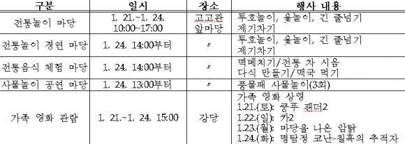 나흘 동안 박물관 마당에서 투호놀이, 긴줄넘기, 윷놀이, 제기차기 등의 전통놀이를 체험할 수 있으며, 강당에서는 ‘쿵푸 팬더2‘ 등의 가족 영화 관람도 가능하다. 이와 더불어 24일(화) 오후에는 가족이 함께 떡메를 치며 다식과 떡국을 만들어 먹고, 전통차(茶)를 마시는 자리도 마련된다. 또한 전통놀이 경연을 펼쳐 참가자 가운데 잘한 사람을 뽑아 소정의 기념품도 준다. 여기에 풍물패의 사물놀이 공연이 어우러져 더욱 즐거운 문화 한마당이 될 것으로 기대된다.