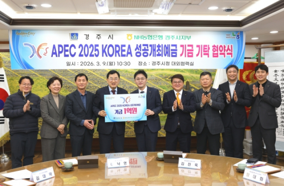 경주시는 9일 시청 대외협력실에서 NH농협은행 경북본부와 ‘APEC 성공개최 예금 지정기탁 협약식’을 갖고 총 1억 원의 기부금을 전달받았다. 이날 협약식에는 주낙영 경주시장과 김진욱 NH농협은행 경북본부장, 황대화 NH농협은행 경주시지부장 등 관계자 7명이 참석했다. 이번 기금은 NH농협은행이 지난해 8월 APEC 정상회의의 성공적인 개최를 응원하기 위해 특별 출시한 ‘APEC 2025 KOREA 성공개최 예금’ 상품을 통해 조성됐다. 해당 상품은 1호 가입자인 이철우 경상북도지사를 시작으로 시·도민들의 높은 관심을 모으며 출시 10일 만에 500억 원을 돌파했고, 48일 만에 판매 한도인 3,000억 원을 조기 달성했다. NH농협은행은 예금 판매액의 연평균 잔액 0.1%를 적립해 3,000만 원을 조성했으며, 여기에 자체 기부금 7,000만 원을 더해 총 1억 원의 기금을 마련했다. 경주시는 예금 가입자들의 참여와 농협은행의 지역 상생 의지가 함께 담긴 이번 기금을 향후 포스트 APEC 로드맵 추진 등 경주시의 미래 발전을 위한 다양한 사업에 활용할 계획이다. 김진욱 NH농협은행 경북본부장은 “시민들의 참여로 조성된 기금을 경주시에 전달하게 되어 매우 뜻깊게 생각한다”며 “앞으로도 지역사회와 함께하는 금융기관으로서 역할을 이어가겠다”고 말했다. 주낙영 경주시장은 “APEC 성공 개최를 위해 함께해 주신 시민들과 농협은행에 감사드린다”며 “이번 기탁금은 포스트 APEC 사업 추진 등 경주시의 미래 발전을 위해 의미 있게 활용하겠다”고 밝혔다.