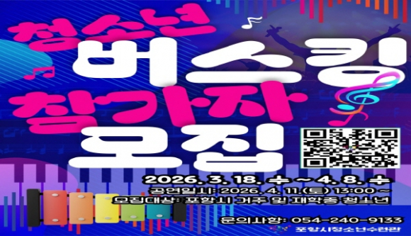 청소년 버스킹 공연은 내달 11일 포항시청소년수련관에서 진행될 예정이다. 김규일 청소년수련관장은 “청소년들이 일상에서 쉽게 참여하고 즐길 수 있는 문화 활동의 장을 제공하고자 이번 무대를 마련했다”며 “많은 청소년들이 참여해 자신의 재능을 마음껏 펼치길 바란다”고 전했다.