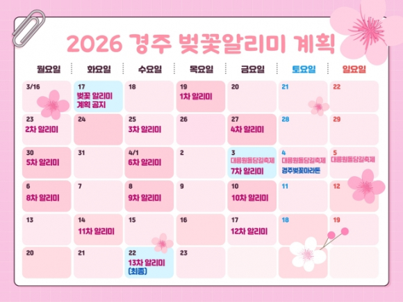 경주시는 2026년 봄을 맞아 문화관광 누리집을 통해 주요 벚꽃 명소의 개화 현황을 실시간으로 제공하는 ‘벚꽃알리미’ 서비스를 운영한다고 22일 밝혔다. ‘벚꽃알리미’는 봄철 경주를 찾는 관광객에게 정확하고 시의성 있는 개화 정보를 제공해 여행 일정 수립과 방문 시기 선택에 도움을 주기 위해 마련됐다. 경주를 대표하는 봄꽃 명소의 개화 상황을 한눈에 확인할 수 있어 관광객 편의 향상에도 기여할 것으로 기대된다. 서비스는 보문관광단지, 대릉원 일원, 황룡원 주변 등 주요 벚꽃 명소를 중심으로 운영된다. 벚꽃의 개화 단계별 정보를 당일 촬영한 사진과 함께 간단한 현장 리포트 형식으로 제공하며, 목련과 유채꽃 등 다양한 봄꽃 정보도 함께 안내할 계획이다. 특히 대표 누리집 메인 배너를 통해 주요 지점의 개화 상황을 실시간으로 확인할 수 있는 CCTV 연계 서비스도 함께 제공한다. 해당 서비스는 경주시 문화관광 누리집을 통해 누구나 무료로 이용할 수 있으며, 개화 시기에 맞춰 관련 정보가 순차적으로 업데이트될 예정이다.