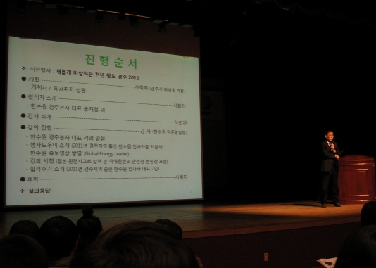 특강에서는 공기업 합격논문 작성비법 소개와 일생 계획표 작성, 일본 원전사고로 관심을 일으키고 있는 국내원전에 대한 자세한 설명과 지역주민 가점제도, 지역할당제 및 경주시 발전을 위한 한수원의 역할 등 경주시민들이 관심을 갖는 주제로 유익한 특강이었다는 평을 받았다.