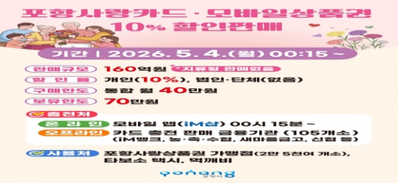 시는 올해 들어 이달까지 총 1,230억 원 규모의 포항사랑상품권을 발행한 데 이어, 이번 할인 판매분 160억 원을 유통해 지역 상권 내 소비를 촉진하고 경기 회복 흐름을 이어간다는 방침이다.