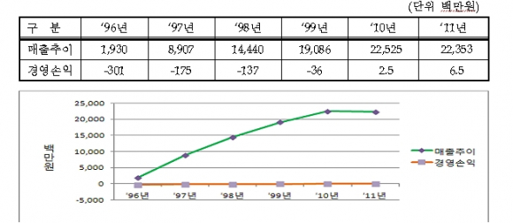 년도별 매출실적 및 경영손익(단위 : 백만원)
