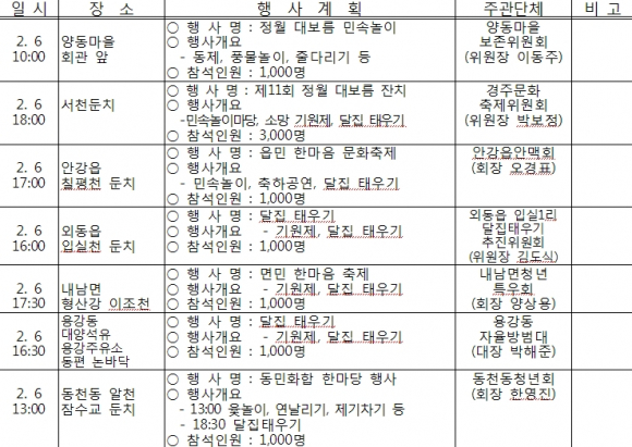 경주시는 양동마을 정월대보름 민속놀이 행사를 마련하고, 새해 안녕을 기원하는 행사를 마련해 시민들과 관광객들의 발걸음을 사로잡을 예정이다.