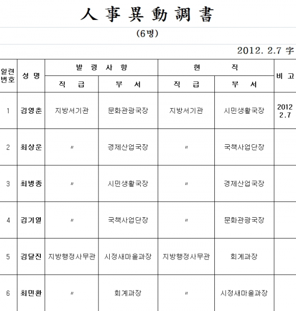 경주시청, 2.7일자 인사이동 조서 발표
