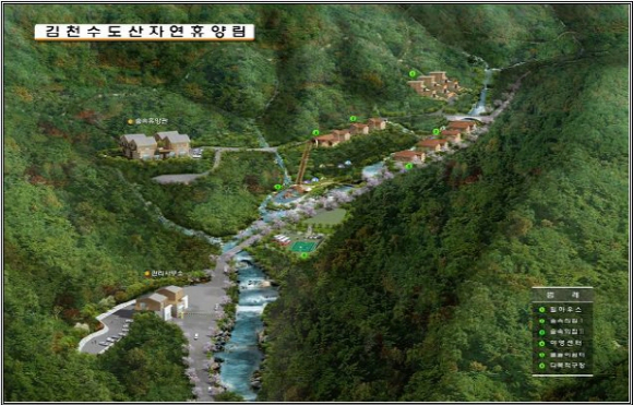 산림휴양 레포츠 기반을 구축하기 위한 노력도 지속적으로 추진된다. 2014년까지 김천시 대덕면 추량리 일대 59ha의 산림에 김천시 수도산 자연휴양림을 만든다. 사업비는 총 160억 원이 투입된다. 숲속휴양관, 숲 생태체험장, 관찰로, 물놀이장, 모노레일 등 가족중심의 체류형 산림문화 휴양시설로 조성할 계획이다.