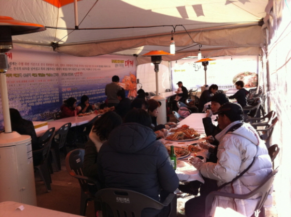포항시 구룡포가 16일 열린 ‘2012 구룡포수산물 한마당잔치’ 개막식 이후로 휴일을 맞아 대게 손님들로 북새통을 이루고 있다. 휴일을 맞아 찾은 방문객은 시민들을 비롯해 대다수 대구, 울산, 구미 관광객들로써 18일, 19일 이틀간 2만 명 정도가 구룡포수산물 한마당 잔치 행사장을 다녀갔다.