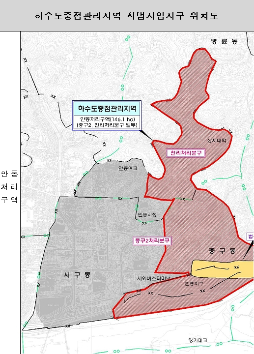 안동시(시장. 권영세)에서는 환경부에서 시행하는 하수도정비 중점관리지역 시범사업 대상지역으로 선정되어 시범 사업비 500억 원을 확보 했다.