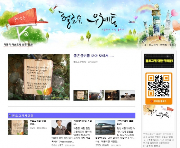 김천시 블로그(http://gchope.tistory.com/)는 김천시민인 블로그 기자단이 참여해 블로그를 운용함으로써 시민과 소통하고 김천의 모습, 이야기를 담아 전국의 누리꾼들에게 알리려고 작년 초 김천시에 개설해 운영해 오고 있다. 헬로우 우체통이란 별칭으로 김천시 홈페이지를 통해 접속할 수 있다.