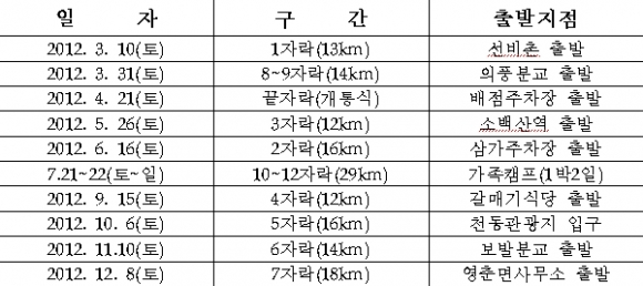 (사)영주문화연구회(회장 박철서)에서는 “사람을 살리는 산” 소백산자락길 토요 걷기 행사를 2012년 3월부터 12월까지 월 1회 실시한다.
