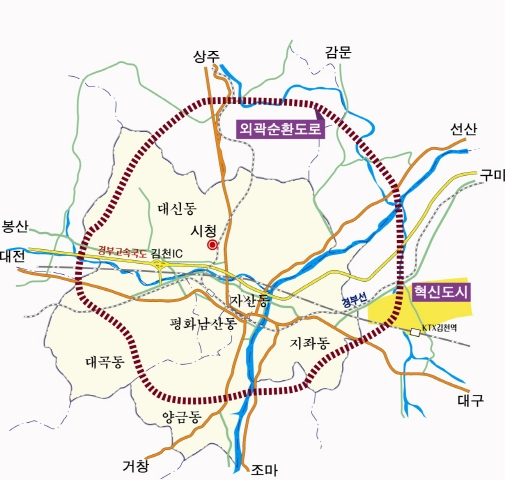 올해 조성되는 구간인 양천동~농소면 월곡리 구간은 거창과 대구방면의 광역교통망을 연결하게 된다. 사업비 1025억 원, 길이 5.42㎞로 현재 공정률 86%를 넘어서며 막바지 공사가 한창이다. 나머지 구간인 어모면 옥률리~대항면 대룡리 간 7.2㎞, 대항면 대룡리~양천동 간 7.5㎞구간은 조기에 완공될 수 있도록 사업을 추진 중이다. 이와 함께 도심에서 외곽으로 접근성을 강화하기 위한 방사형 도로 건설사업도 활발히 진행되고 있다. 김천1일반산업단지를 경유하는 상주방면의 국도3호선 4차로 건설공사가 지난해 완공됐고 거창방면 양천동~지례면 교리 간, 국도3호선이 2013년 완공된다.