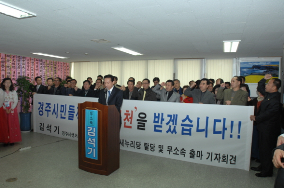 새누리당의 19대 국회의원선거 경주지역 공천이 전략공천지역으로 발표된 후, 여러 상황을 거져 현역 의원에게 공천이 돌아갔다. 공천에서 탈락한 김석기 예비후보는 즉각 탈당을 선언하고 ‘시민공천’을 받아 반드시 승리하겠다며 무소속 출마를 표명하는 기자회견을 가졌다.