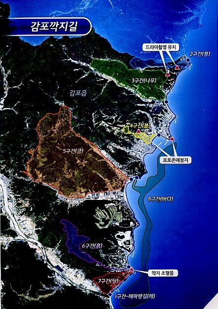 감포깍지길은 총 8개구간으로 설정되며, 문화관광부에서 추진하는 부산에서 고성까지의 해파랑길 테마를 강화하고 감포의 해안과 내륙, 바다를 육지로 끌어올려 전지역을 연결하는 탐방코스로 진행된다. 감포의 탐방길 테마는 손으로 만드는 세상과 길 위에 있는 자연을 서로 조화시켜 만들어진다.
