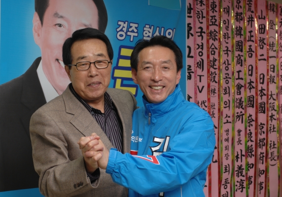 김석기 후보와 백상승 전 경주시장은 경주의 구태정치를 걷어내고 새로운 변화의 시대를 여는데 뜻을 같이 하기로 약속하고 4.11 총선의 승리를 위해 서로 힘을 모아 전력을 다하자고 다짐했다. |