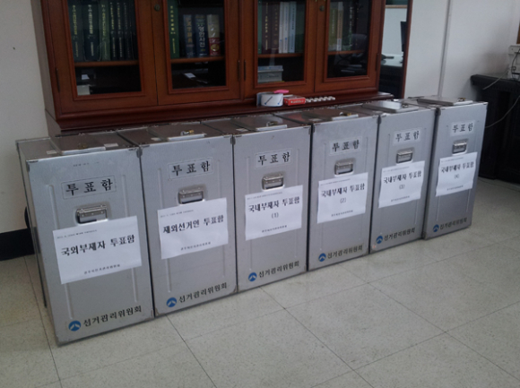 각 선관위에는 부재자 투표함이 쏙쏙 도착하고 있으며 각 읍면동에서는 선관위를 찾아 투표용지를 수령하고 있다.