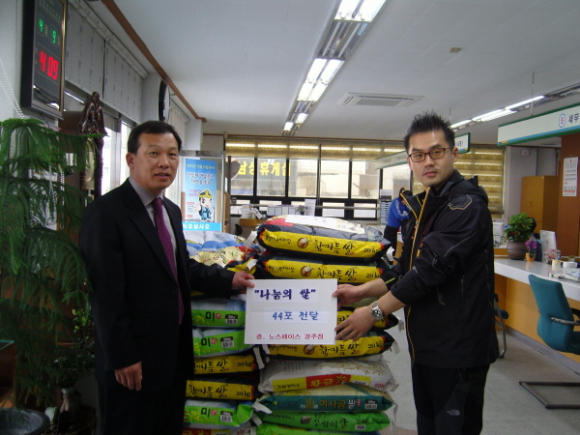 노스페이스 경주점(대표 박진혁)은 2012년 4월 9일 중부동주민센터(동장 황석호)를 방문해 백미 20kg 44포를 기증했으며 기증받은 백미는 관내 비수급 독거노인 44가구에 전달했다.