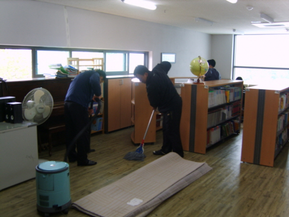 일손이 모자라서 청소할 엄두도 못 내던 도서실, 디지털실, 국악자료실 등을 깨끗하게 청소했고, 평소에 손질을 못하던 전등갓을 새것처럼 손질하여 재설치하는 등 환경을 정비하는 모습이 자못 진지했다.