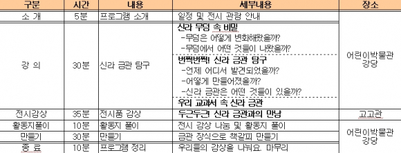<세부일정표> - 진행내용: 신라금관을 주제로 강의, 전시품 감상(활동지 작성), 만들기 등 - 진행일시: 2012년 4~12월 중 평일(화,수,목,금/ 9:30~17:00) 중 선택일시 ※2시간 소요 - 참여대상: 초등학생 4~6학년 학급단체 50명 내외 ※50명 이상은 만들기 진행이 어려움 - 신청방법: 유선협의 후 참가신청서를 작성하여 이메일 접수 - 일정협의: 학예연구실 이지원 (054.740.7536/jiwon1027@korea.kr)