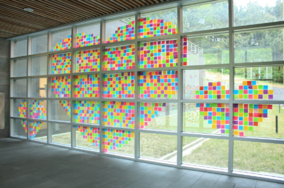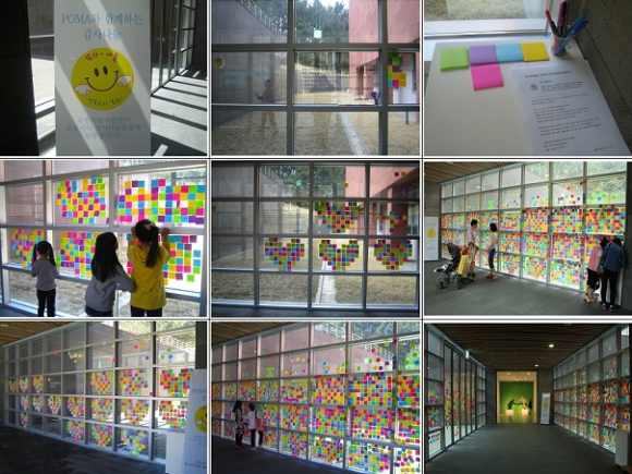 포항시립미술관에 형형색색의 초대형 하트가 등장했다. 3,4전시실 통로의 대형 유리창을 환하게 빛내고 있는 이 대형하트는 사실 관람객 한 분 한 분의 소중한 이야기들로 꾸며진 시민들의 공동 작품(?)이다. 미술관과 전시를 관람하면서 느꼈던 감사의 마음, 가족과 친구들에게 평소 전하고 싶었던 말들, 그리고 포항시와 미술관의 발전을 위한 다양한 의견들로 이루어져, 시민들의 소중하고 솔직한 의견들을 직접 확인할 수 있는 의미로 가득 찬 작품이다. 시민들의 마음을 나누는 장이자, 최근 포항시에서 적극적으로 추진하고 있는 감사나눔운동의 미술관 버전이라고 할 수 있다. 포마가 실천하는 색다른 감사나눔운동!