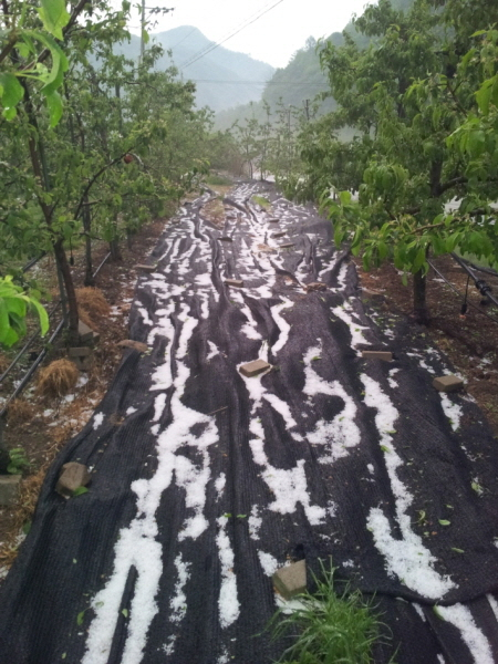 포항시 죽장면 일원에 8일 저녁 무렵 우박이 쏟아져 327ha의 농작물 피해가 발생했다.