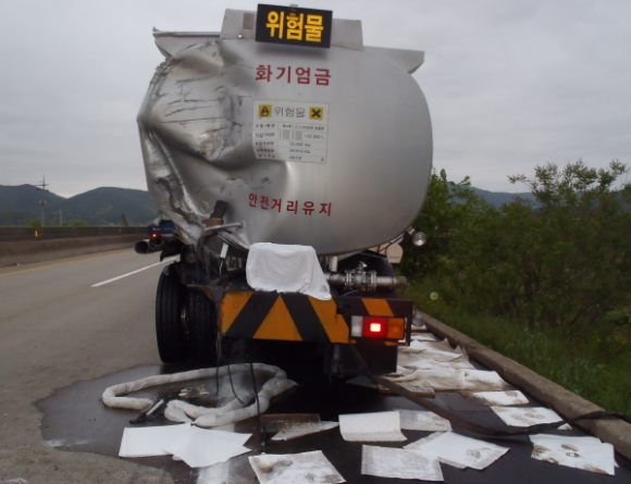 경주소방서에서 현장에 도착했을 당시 화물차 운전석 부분 최성기最盛期 화재로 진행 중이었으며, 현장 확인 한 바 심**(남,50세)가 운전하는 택배차량이 앞서가던 울산 특수화학차(탱크로리)의 뒷부분을 추돌하면서 택배차량의 엔진부분에서 화재가 발생하여 운전석 및 화물칸 일부분이 소실된 사건이다.