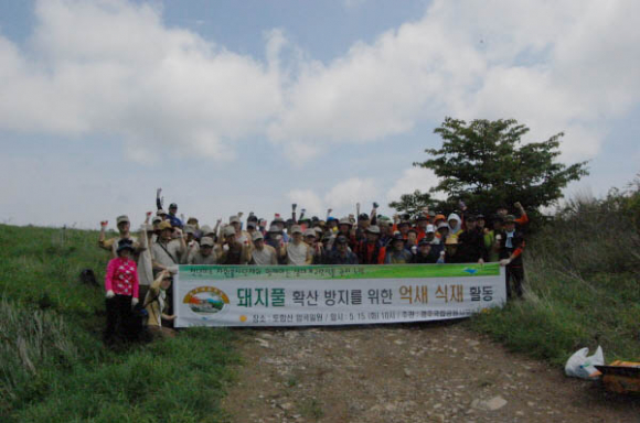 국립공원관리공단 경주국립공원사무소(소장 김경출)는 포스코 천년미소 봉사단과 함께 지난 15일 토함산지구 무장봉 일원의 생태계교란야생식물(돼지풀) 서식지에 억새 4500본을 식재했다고 밝혔다.