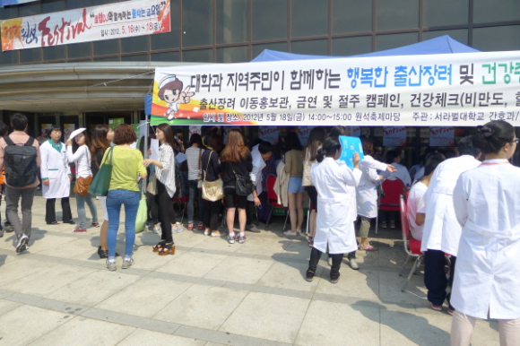 저출산이 국가적인 위협 요인으로 작용하고 있는 가운데 결혼가치관의 변화, 출산연령의 상승, 결혼을 미루고 있는 미혼남녀가 증가하고 있는 가운데 관내 대학생 축제기간 중 각 대학교를 순회 방문하여 국가가 처한 저출산의 위기현황과 심각성을 인식시키고 출산장려 분위기 조성을 위해 관련 홍보현수막, 리플렛 및 홍보용 물티슈, 칫솔, 투포켓 화일 배부 및 캠페인 행사를 출산장려 특강과 더불어 전개했다.