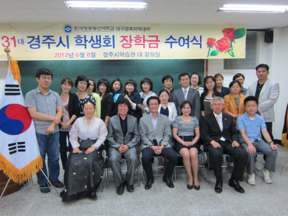 경주시학생회는 장학금을 마련하기 위해 지난달 26일 경주 포항생선구이에서 ‘이웃과 함께 하는 일일호프’를 열어 기금을 마련했고, 대구· 경북총동문회 황금천 동문회장의 장학금 기탁이 있었다. 이날 장학금은 대구· 경북지역대학 이성철 학장과 대구· 경북총동문회 황금천 동문회장, 경주시학습관 정찬진 관장이 수여했다.