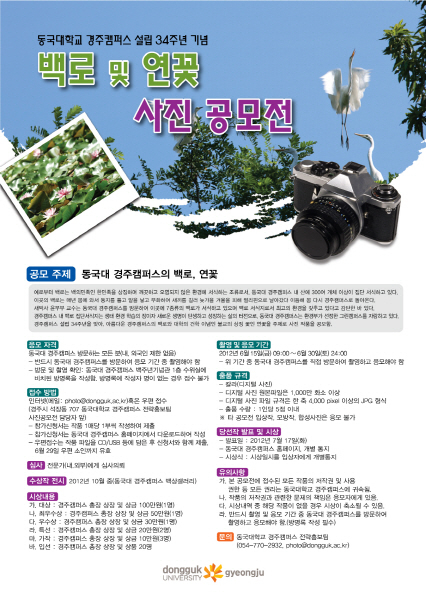 동국대 경주캠퍼스 설립 34주년을 기념하기 위해 기획된 이번 공모전은 동국대 경주캠퍼스에 서식하고 있는 백로와 불교의 상징 꽃인 연꽃을 주제로 사진 작품을 공모한다.