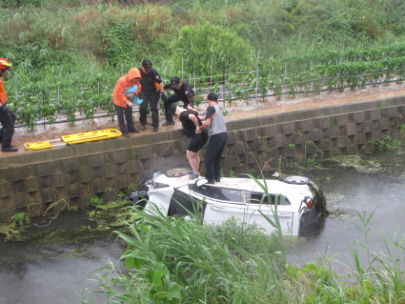 19일 오전 8시 19분경 경주시 강동면 모서리 S-oil주유소 부근에서 승용차량 2대가 충돌하여 도로 옆 개천으로 전복된 사고가 발생했다.