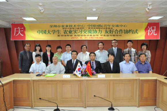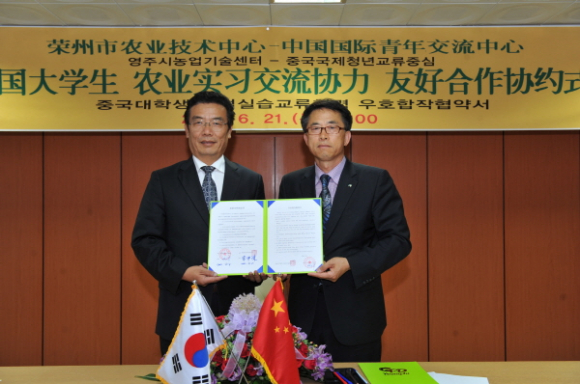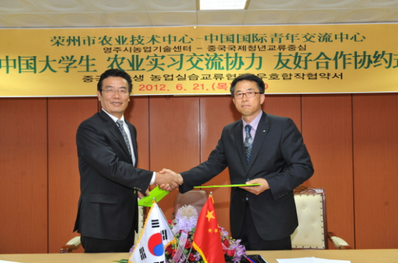 영주시농업기술센터(소장 이갑수)는 지난 21일 오후 3시 영주시청 회의실에서 중국국제청년교류센터와 중국대학생농업실습프로그램 추진을 위한 우호합작협약을 체결했다. 이번 협약을 체결하기 위하여 중국국제청년교류센터 양리후아(楊立華) 부주임 등 6명의 중국청소년지도자 대표단이 영주시를 방문했다.