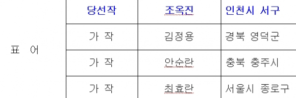 그리고 기존에 입상한 가작 3작품과 추가로 심사 선정한 작품 1점을 대상으로 2차 심사한 결과 조옥진(인천 서구)씨의 “역동하는 김천에서 비상하는 경북의 꿈”을 당선작으로, 김정용(경북 영덕)씨의 “일류김천 힘찬 기상 함께하는 도약체전”, 안순란(충북 충주)씨의 “혁신도시 김천에서 역동하는 경북의 힘”, 최효란(서울 종로구)씨의 “펼쳐라 경북의 기상 혁신도시 김천에서”를 가작으로 최종확정했다.