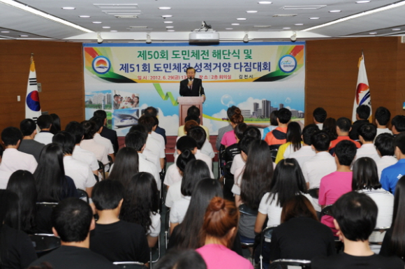 김천시는 6월 29일(금) 오후 1시 시청 2층 회의실에서 박보생 김천시체육회장을 비롯한 체육회 임원, 선수단 등 100여명이 참석한 가운데 “제50회 경북도민체육대회 김천시 선수단 해단식 및 제51회 도민체전 성적거양 다짐대회”를 가졌다.