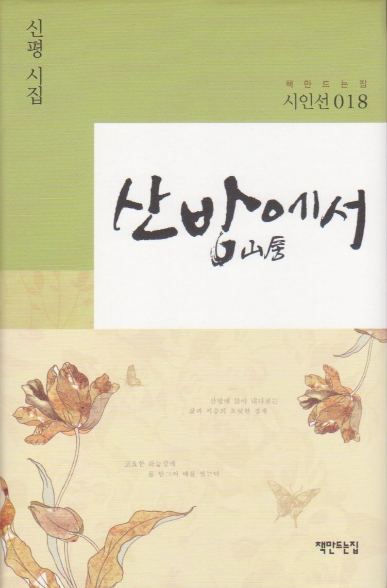 신평 시인은 경주시 고란, 산허리 한 자락에다 집을 짓고 ‘심허산방心虛山房’이라 이름 지었다. 1년이 족히 넘는 세월동안 산방에서 홀린 듯 지내면서 늦가을부터 시작하여 사계절의 변화를 머리에 뚜렷이 각인하며 하늘과 구름을 쳐다보는 사이, 마음의 때가 약간 벗어짐을 느꼈다고 한다. 그래서였을까? 좋은 시를 뽑아야겠다며 심혈을 기울인 끝에 시집『산방山房에서』가 나왔다.