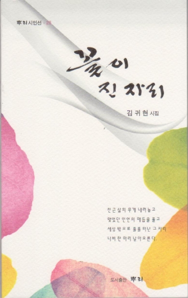 세 번째로 소개하는 시집은 뿌리시인선 26권으로 뿌리출판사에서 출판 된 『꽃이 진 자리』김귀현 시인의 시집은 여성 특유의 생활에서 찾은 소재로 누구나 읽고 편안하게 공감할 수 있다.