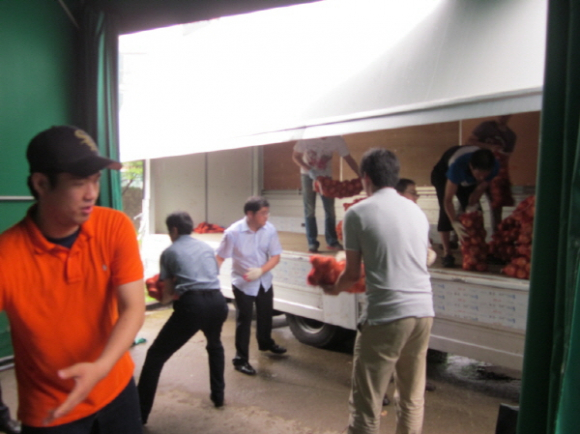 이날 농림수산검역검사본부(본부장: 박용호) 임직원들은 수송차량을 직접 임차해 자매마을의 양파 370망, 감자 98박스, 양파즙 83박스 8백5만천 원 상당의 농산물을 구입했다.