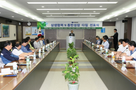한국방사성폐기물관리공단(이사장 송명재, 이하 공단)은 12일 중저준위방폐장이 건설되고 있는 월성원자력환경관리센터에서 공단 주요간부와 방폐장 건설에 참여하고 있는 대우, 삼성을 비롯 석원, 유호, 선광 등 협력사 대표가 참석한 가운데 KRMC 동반성장 다짐 선포식을 가졌다.