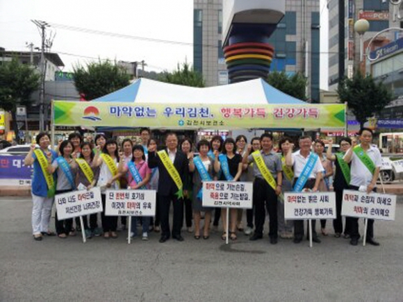 김천시보건소 직원 및 김천시 약사회원들은 불법마약류 남용의 폐해를 알리는 어깨띠를 착용하고 지나가는 시민들에게 마약퇴치 리플렛 및 홍보물을 배부하고 무료 니코틴 측정을 통해 시민들의 호응을 얻었다.